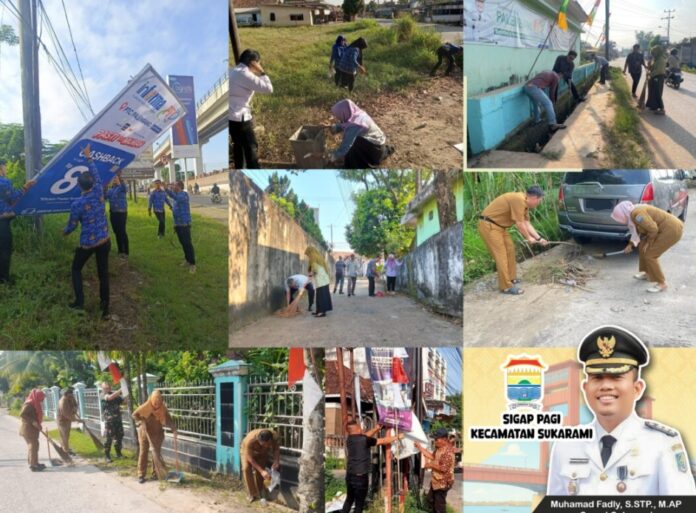 Sumsel.Tajam.co.id, Palembang – Camat Sukarami Muhamad Fadly, S.STP., M.AP bersama jajaran kecamatan melaksanakan kegiatan SIGAP Pagi (Sinergi Gotong Royong Aksi Pagi) di sejumlah titik wilayah Kecamatan Sukarami, Senin (21/07). Kegiatan ini merupakan bentuk komitmen Pemerintah Kecamatan Sukarami dalam menjaga kebersihan, ketertiban, dan kenyamanan lingkungan.